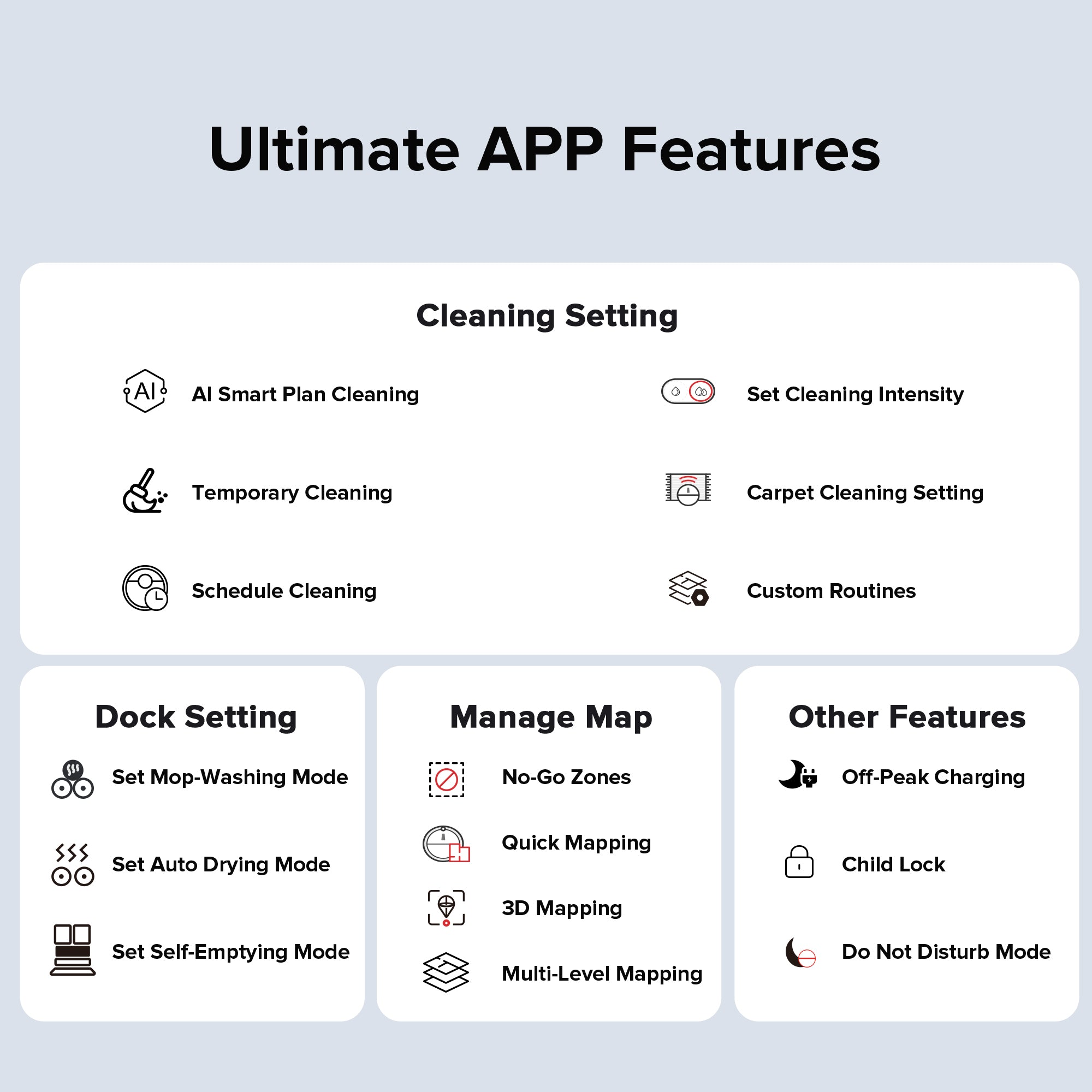 •Third-Party Voice Control Voice commands via Amazon Alexa, Apple Siri, or Google Home. •Launcher Widgets One-click access to custom cleaning routines. •Apple Watch App Quickly start cleanups or do a status check.