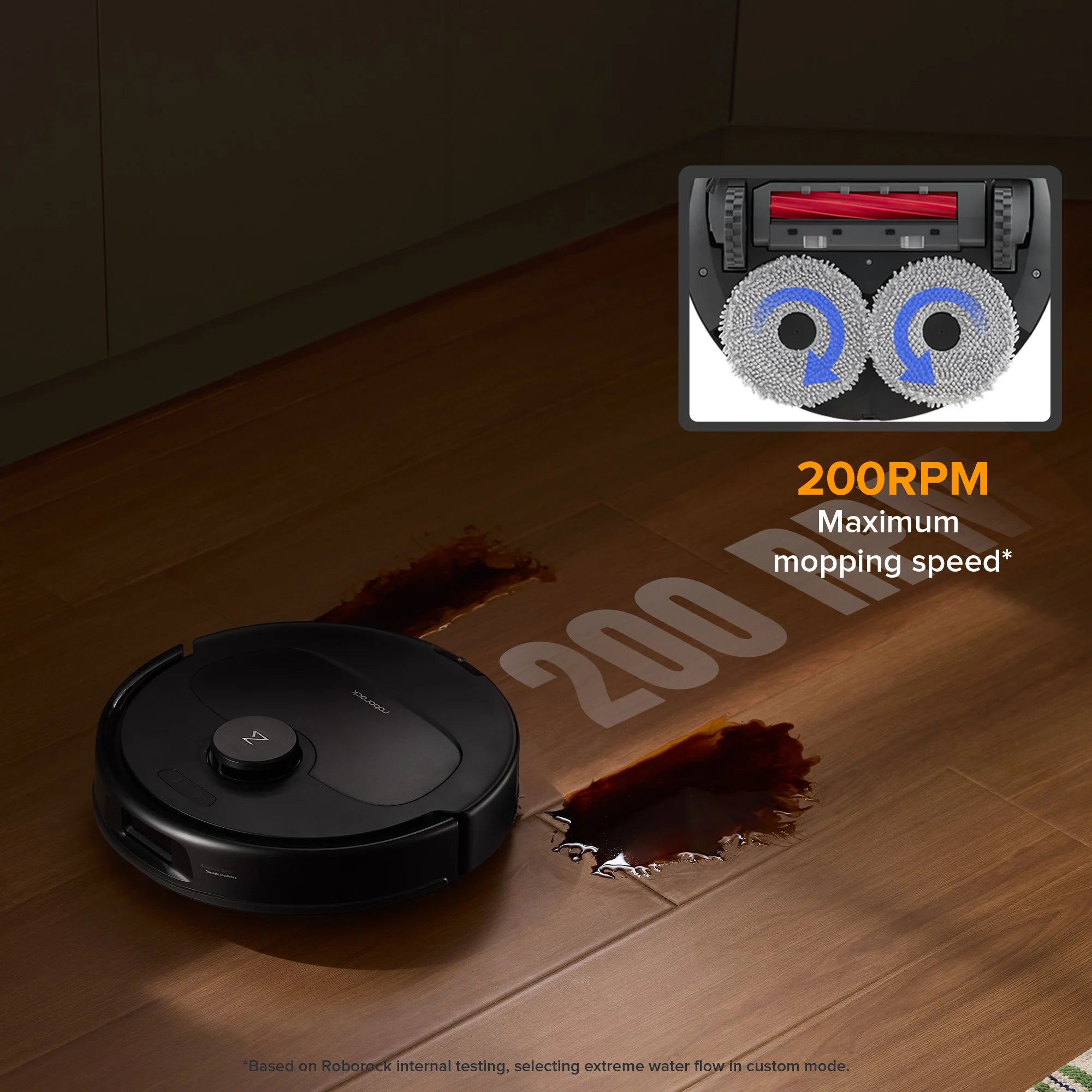 Dual mopping pads spin up to 200 revolutions per minute*, removing stubborn stains, and mimicking hand-mop results. *Based on Roborock internal testing, selecting extreme water flow in custom mode. Actual results may vary depending on usage conditions.