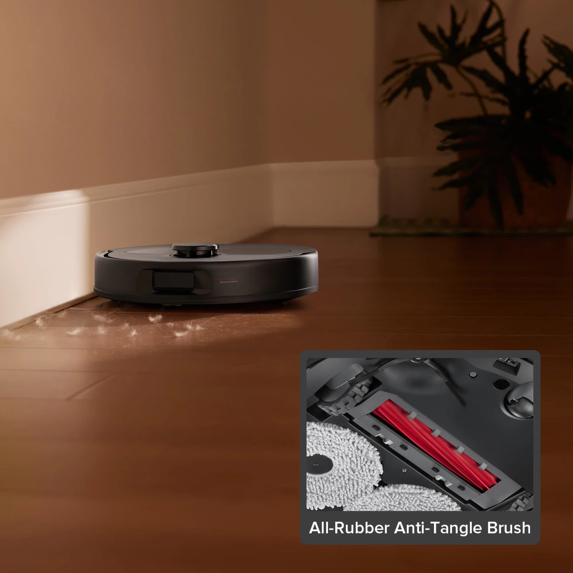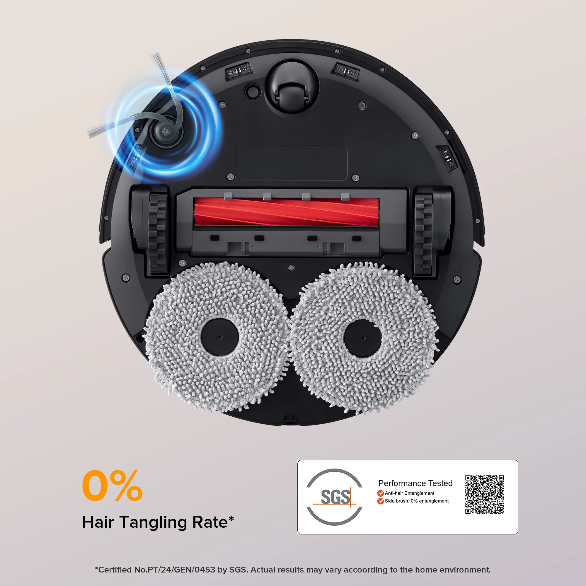 The spiral-designed rubber floating main brush and arc-shaped asymmetric side brush effectively remove hair for optimal and hand-free cleaning.
