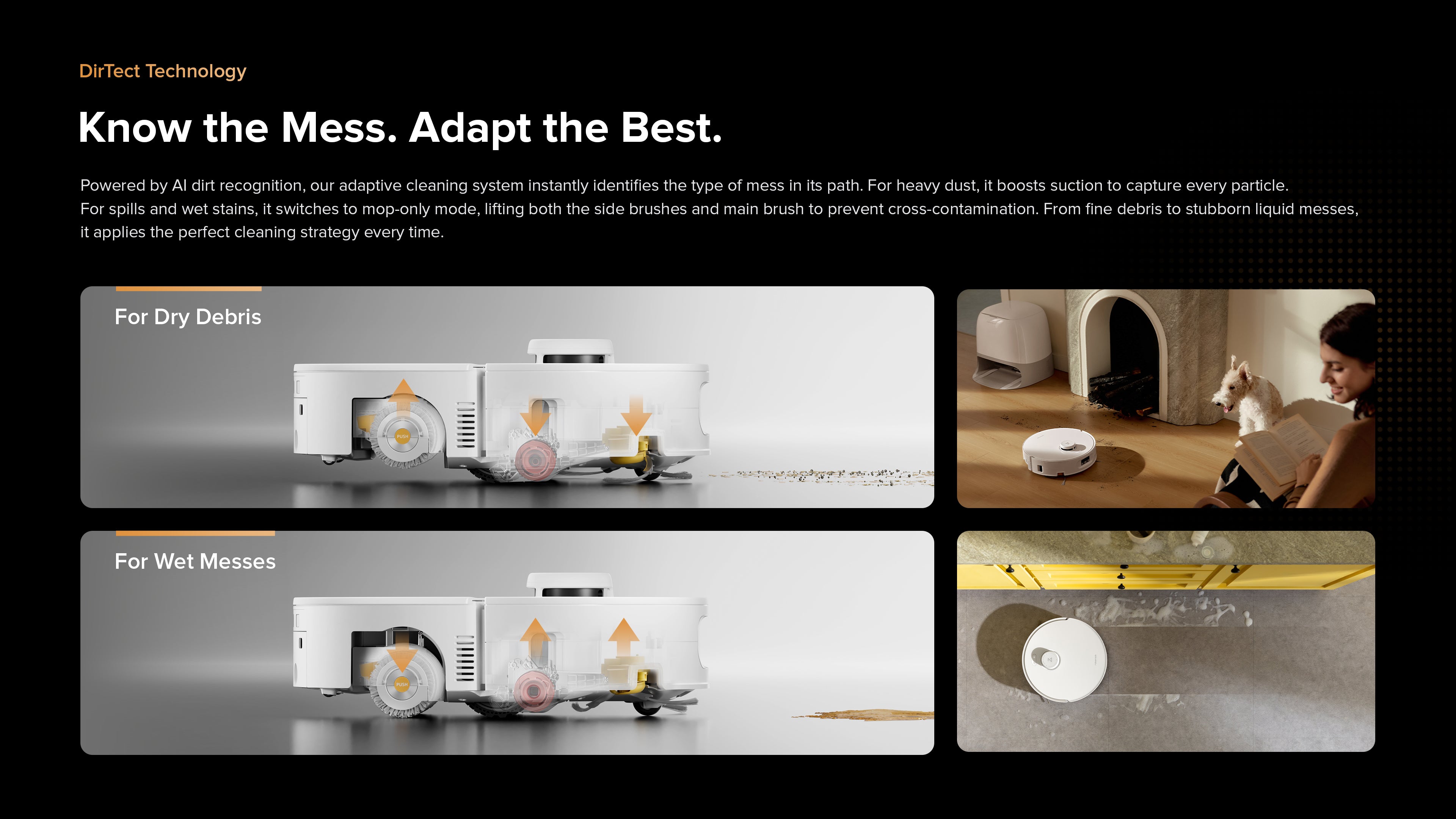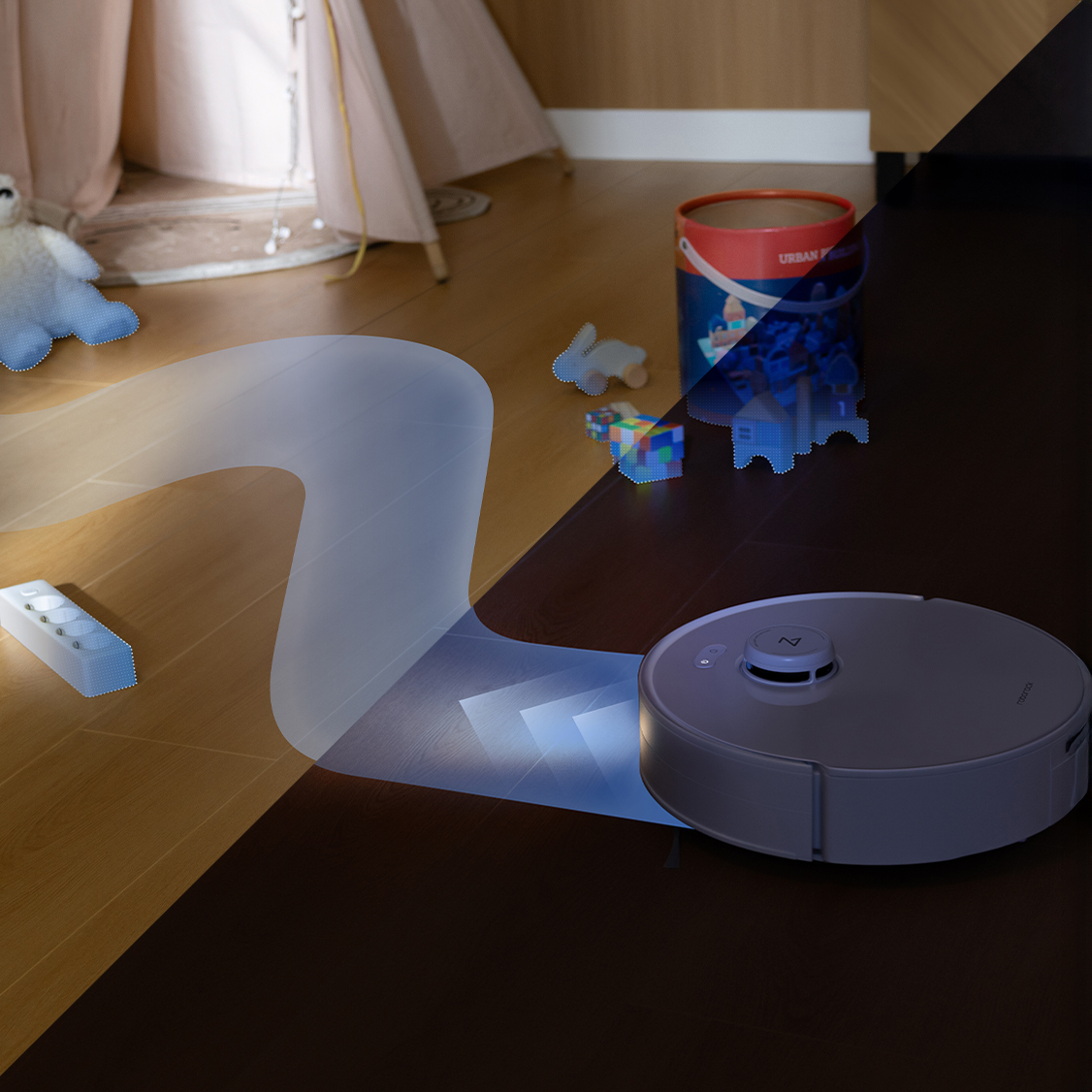 No Need to tidy up before cleaning. Powered by structured light and an RGB camera, the robot spots and avoids over 200 types of common clutter - from tangled cables to pet surprises - day or night.