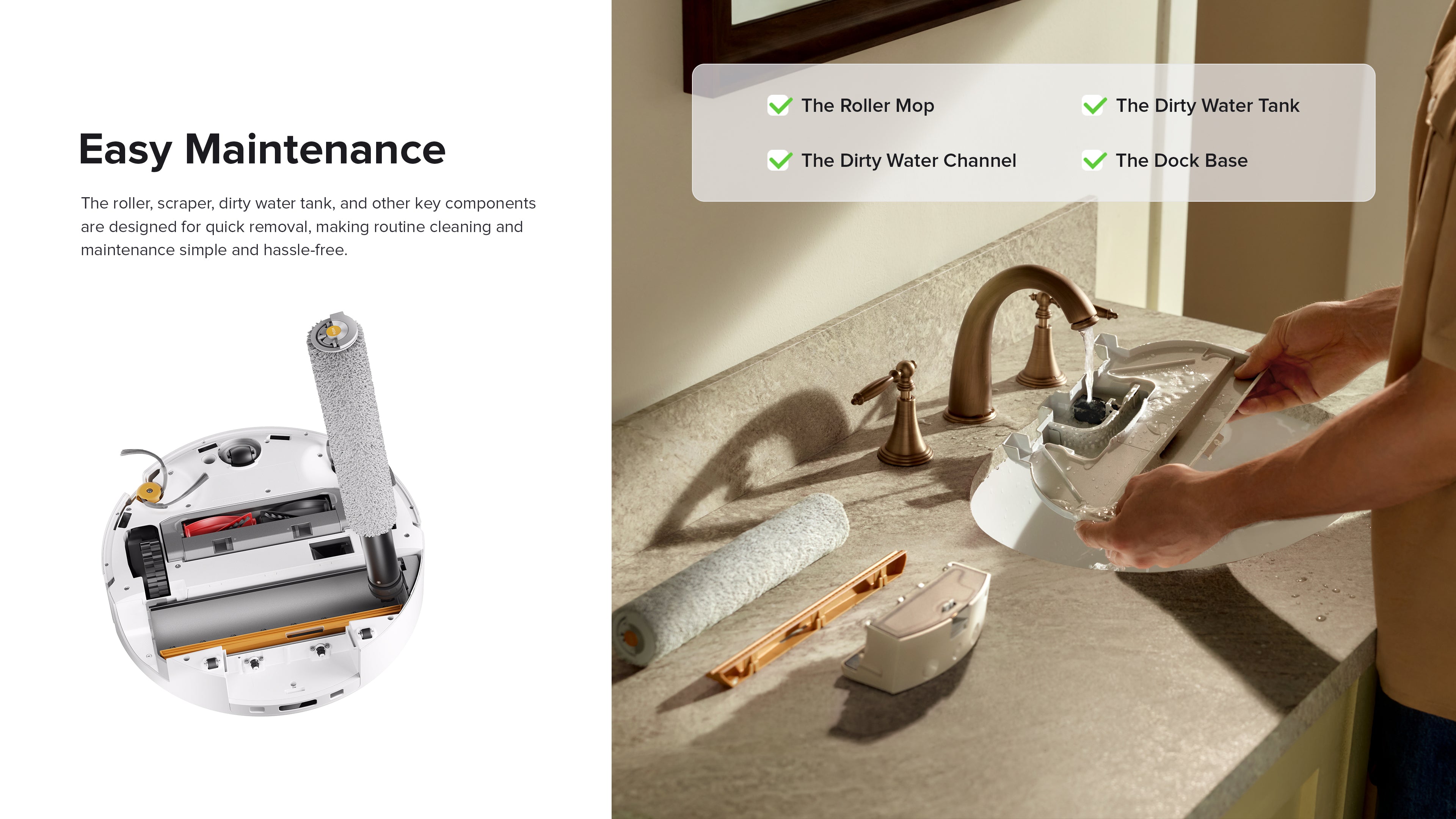 Powered by 22RPM high-speed rotation and enhanced downward mopping pressure, the roller mop scrubs deep into spills and high-traffic messes with a continuous supply of fresh water. A precision scraper removes excess moisture and channels dirty water into the wastewater tank, keeping the roller fresh every time.