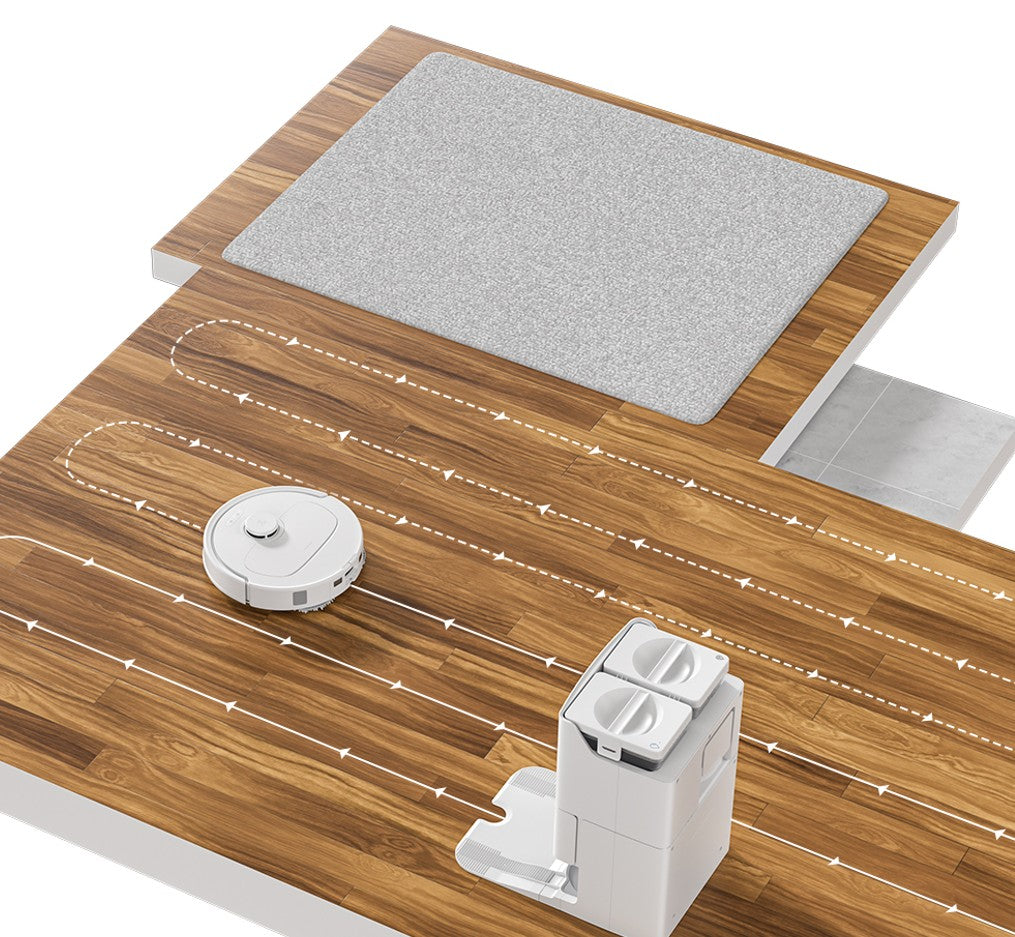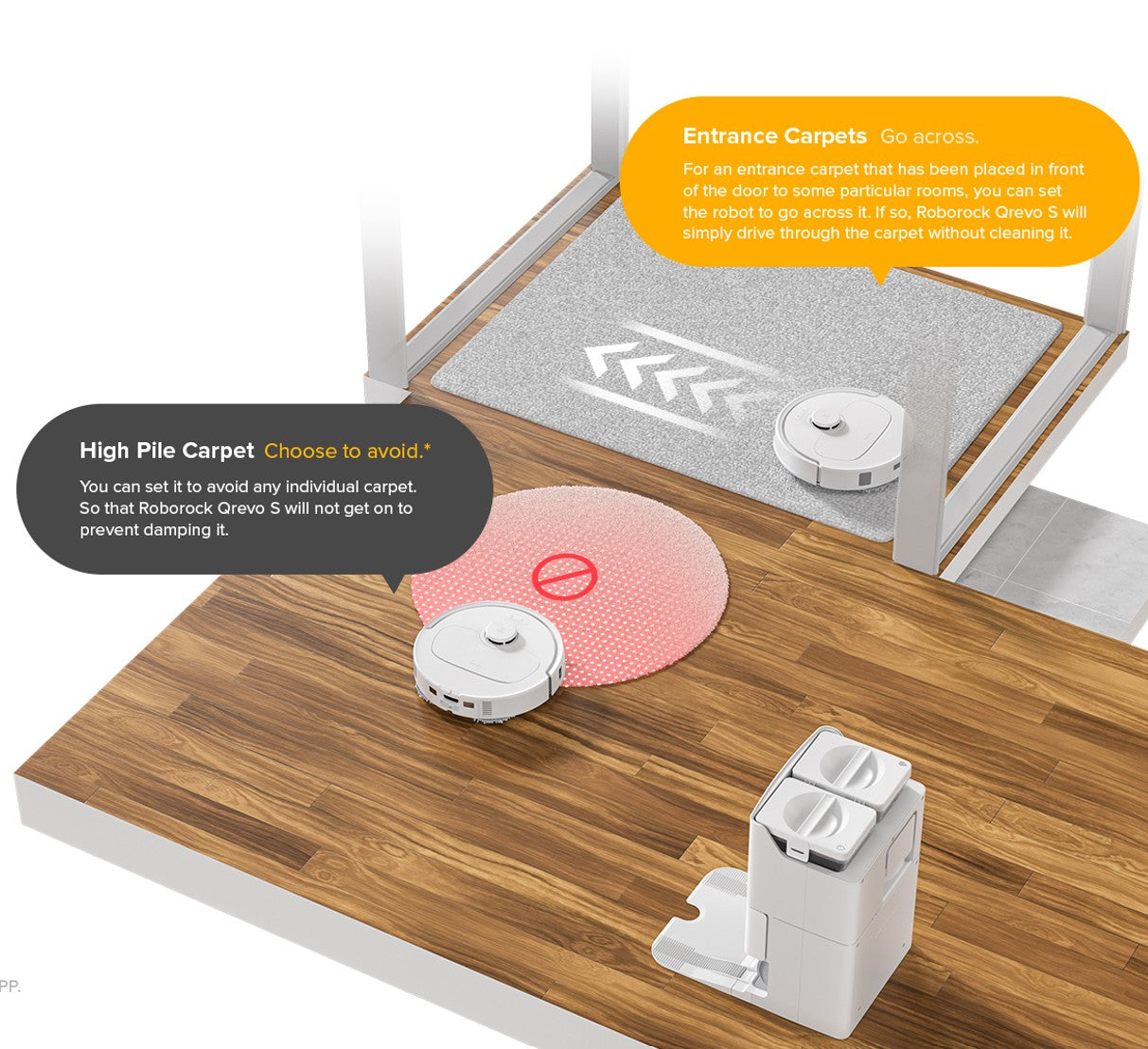 Care for your carpets as you do, different strategies can be set separately on each individual carpet*. Carpet Boost: Boost suction power when on carpets. Deep Carpet Cleaning: Clean your carpet twice for each room. Vacuum Carpet First: Vacuum carpet first with a dry mop. Then start to mop. *Carpet cleaning strategies need be set manually in Roborock App.