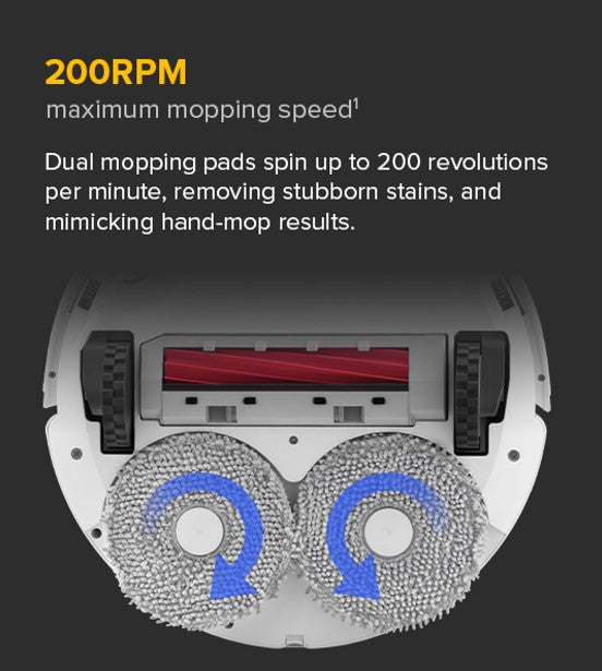 •200RPM Maximum Mopping Speed¹ Dual mopping pads spin up to 200 revolutions per minute, removing stubborn stains, and mimicking hand-mop results. •30 Levels of Constant Dampness Water Flow² You can finely adjust water flow in detailed 30 levels to meet needs of different floor types and humidity conditions. 1. Based on Roborock internal testing, selecting extreme water flow in custom mode. Actual results may vary depending on usage conditions. 2. Available in Roborock App with manual settings.