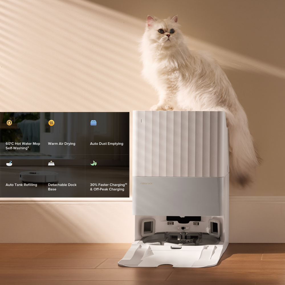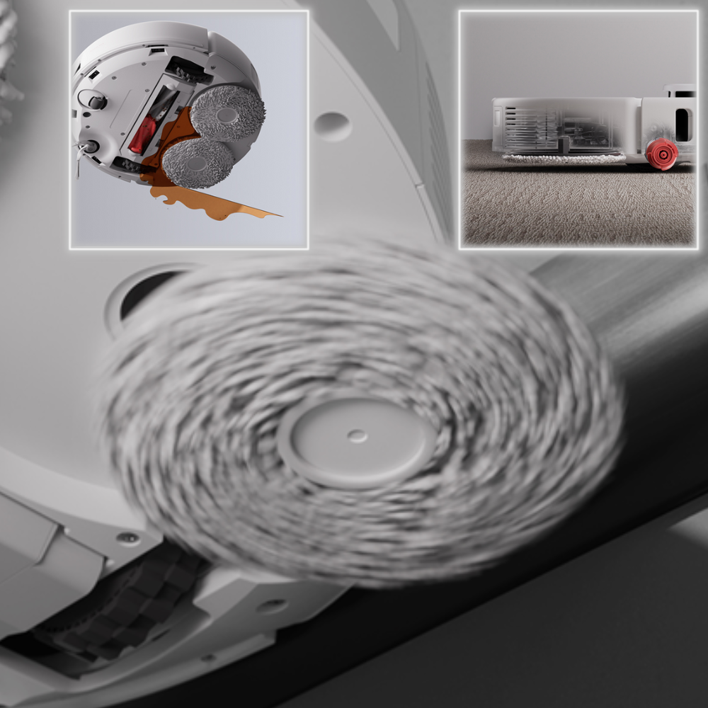 Equipped with dual liftable spinning mops. the robot tackles stubborn stains on hard floors. Plus, when it detects carpets, the mops automatically lift to keep them dry, ensuring a seamless clean.