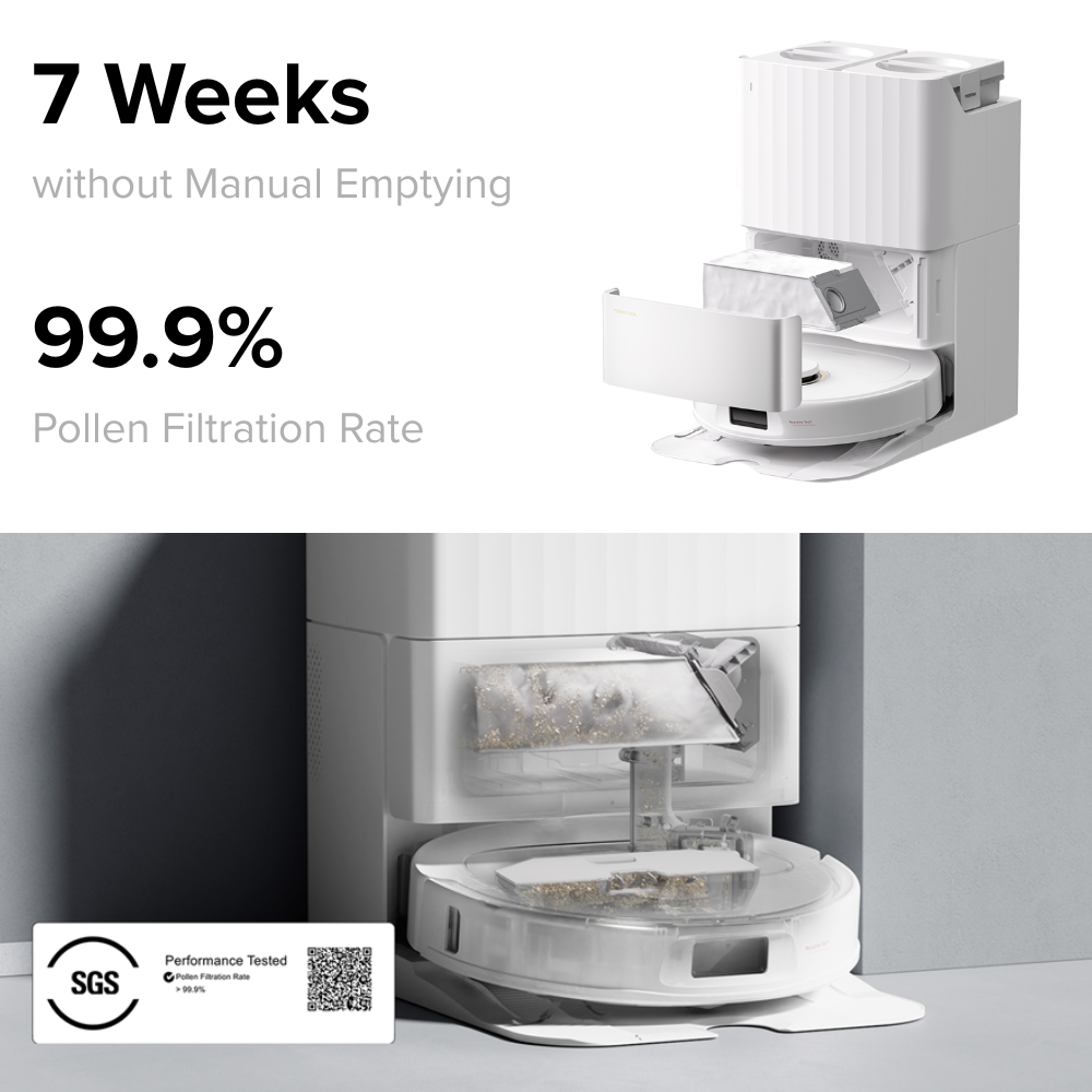 The dock's 2.7L E12-rated dust bag automatically empties the robot's dustbin, letting you go up to 7 weeks without manual emptying, giving you long-term convenience.